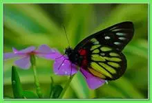报喜斑粉蝶是粉蝶科斑粉蝶属的一种动物,又名红肩粉蝶、藤粉蝶等。幼虫群集性很强,从同一卵块孵化出的幼虫,幼龄期全部群集在一起取食,高龄幼虫常分散成小群。幼虫群集危害叶片,造成秃枝,严重者可将树吃成光杆,…全部>>