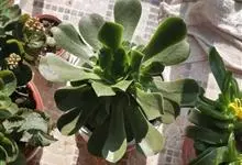 唐印为景天科伽蓝菜属的多年生肉质草本植物。植株中型,株高50厘米,宽20厘米,多分枝;叶片肉质,对生,卵形,全缘,先端钝圆,叶片淡绿色至灰绿色,表面被有厚厚的白粉,光照充足时,叶缘呈红色;圆锥花序,…全部>>