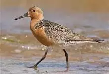 红腹滨鹬,是鹬科、滨鹬属的小型涉禽,体长23-25厘米,嘴较短而直、黑色,脚亦甚短、绿色。体较粗胖。夏季上体灰褐色具黑色中央纹,背具棕栗色和白色斑纹和羽缘,头侧和整个下体栗红色。冬季棕红色消失,…全部>>