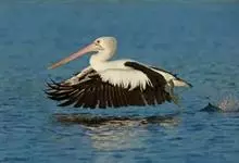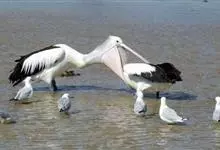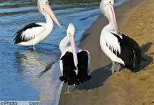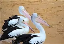 澳大利亚鹈鹕是一种大型涉禽,体重达13千克。生活于沿海及河川、湖泊等处。飞行力强而悠逸,常群飞群栖,极善于游泳,但不会潜水。游泳时张口捕鱼,将捕得的鱼兜入喉囊内。有时结群,排成长线,…全部>>