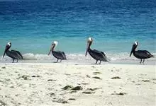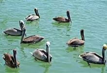 褐鹈鹕:是鹈鹕家族中体型最小的成员。体型粗大,体重6.5-9千克。嘴形宽大直长,上嘴尖端朝下弯曲,呈钩状;下嘴分左右二支,其间有一巨大而能扩缩的皮肤喉囊;鼻孔小,而位于嘴基。眼前部裸出。颈长而较细小…全部>>