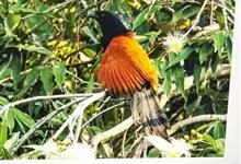 褐翅鸦鹃,是鹃形目鸦鹃科鸦鹃属的鸟类。褐翅鸦鹃的身体为黑色;头颈和胸带蓝紫色金属光泽并具黑亮的羽干纹,下胸至腹部泛金属绿光泽;两翼和肩部为棕栗色,外侧飞羽具暗色羽端,尾羽闪铜绿色光泽;虹膜赤红色,…全部>>