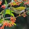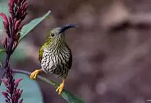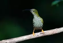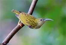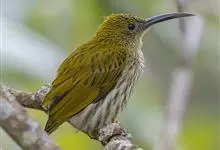 纹背捕蛛鸟:为太阳鸟科捕蛛鸟属的鸟类。是太阳鸟科中体型较大的一种,体重25-45克,体长160-210毫米。嘴粗长而尖且向下弯曲。上体橄榄黄色具黑色中央斑纹。下体淡黄白色满布黑色纵纹,尾具黑色次端斑。…全部>>