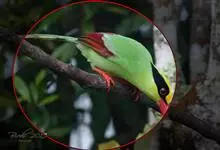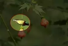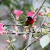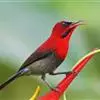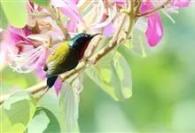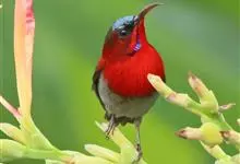 叉尾太阳鸟,雀形目太阳鸟科太阳鸟属留鸟;为小型鸟类,雄鸟头顶辉蓝绿色,上体橄榄绿色,腰明黄色,中央尾羽亮翠蓝色,羽轴针状延长,外侧尾羽黑色具白色端斑,头侧黑色,颜、喉和胸为绛红色,…全部>>