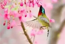 黑胸太阳鸟:小型鸟类,体长9-15厘米。嘴细长而向下曲。雄鸟中央尾羽特长,尾呈楔形,头顶至后颈紫蓝色具金属光泽;背褐红色,腰有一黄色横带,尾上覆羽和尾紫蓝色;颏、喉和上胸乌黑色,有的下胸为硫黄色,…全部>>