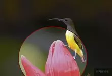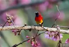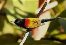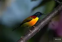 黑胸太阳鸟:小型鸟类,体长9-15厘米。嘴细长而向下曲。雄鸟中央尾羽特长,尾呈楔形,头顶至后颈紫蓝色具金属光泽;背褐红色,腰有一黄色横带,尾上覆羽和尾紫蓝色;颏、喉和上胸乌黑色,有的下胸为硫黄色,…全部>>