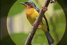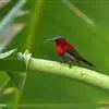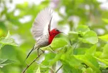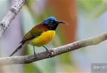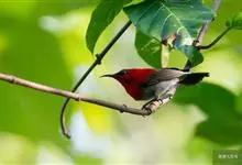 绿喉太阳鸟:共有9个亚种。小型鸟类,雄鸟体长13-15厘米、雌鸟10-12厘米。雄鸟前额至后颈、颏和喉辉绿色,头侧黑色,颈侧和背暗红色,两肩、下背橄榄绿色,腰鲜黄色,尾上覆羽和中央尾羽暗绿色,…全部>>
