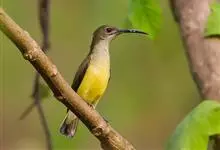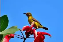 黄腹花蜜鸟是雀形目太阳鸟科花蜜鸟属鸟类。体型较小、喙略短而弯、腹部黄色。雄鸟繁殖季节颏及胸黑紫色并泛金属光泽,具有绯红色及灰色胸带,将上腹部黑色斑与前胸隔开,肩斑为橙黄色丝质羽,上体橄榄绿色,…全部>>