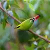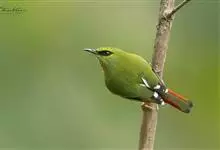 火尾绿鹛是莺科、绿鹛属小型鸟类,体长11-14厘米。上体绿色,头顶至枕具黑色鳞状斑,眼先和眼后黑色,眉纹黄绿色。两翅黑色具黄色和红色翅斑及白色端斑,极为醒目。中央一对尾羽绿色,外侧尾羽鲜红色。…全部>>