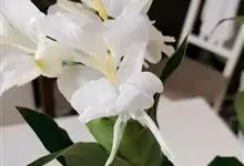 姜花又名野姜花。是姜科姜花属的多年生草本植物,茎高1-2米;叶片长圆状披针形或披针形,叶面光滑,叶背被短柔毛;穗状花序顶生,椭圆形,花芬芳,白色;蒴果卵状三棱形,微黄绿色;种子鲜红色,具橘红色的假种皮。…全部>>