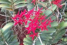 火焰兰,是兰科火焰兰属的附生草本植物。火焰兰茎质地坚硬,圆柱形;叶是舌形或长圆形;圆锥花序或总状花序疏生多数花,花火红色,花瓣相似于中萼片而较小,先端近圆形,边缘内侧具橘黄色斑点;花期4-6月。…全部>>