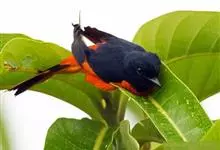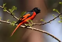 灰喉山椒鸟:共有8个亚种。体长18-22厘米。雄鸟头部和背亮黑色,腰、尾上覆羽和下体朱红色,翅黑色具一大一小的两道朱红色翼斑。中央尾羽黑色,外侧尾羽基部黑色,端部红色。…全部>>