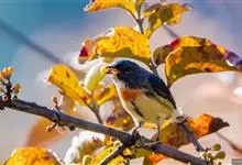 黄腹啄花鸟:体重11-16克,体长104-117毫米。是一种体型大,下腹部为艳黄色的啄花鸟,雄鸟特征为头黑色,喉部有白色纵斑、喉侧及上体成对比,两翅和尾黑色,外侧尾羽内翈具白色斑块。其余下体淡黄色。…全部>>