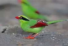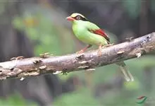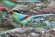 蓝绿鹊:中型鸟类,共有5个亚种。体长36-38厘米。尾长,嘴、脚红色。通体羽色主要为草绿色,宽阔的黑色贯眼纹向后延伸到后颈,在绿色的头侧极为醒目。两翅栗红色,内侧飞羽具黑色次端斑和白色尖端。尾绿色,…全部>>