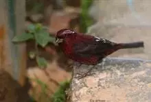 藏朱雀:全长约17-18厘米。雄鸟头部深红色具光辉,喉部暗红色具白色点斑;背部灰白色,各羽具玫瑰红色羽端,形成许多斑纹;腰部淡玫瑰红色;翅暗褐色,沾灰白,羽端沾玫瑰红或灰白色;尾暗棕色,端缘玫瑰红色…全部>>