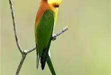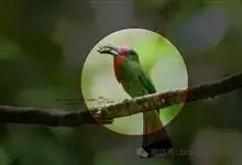 栗喉蜂虎是蜂虎科蜂虎属的鸟类。有热带鸟类羽毛艳丽的特征:喉部是栗红色的,黑色的过眼纹,翅膀和背部是绿色的,尾翼是蓝色的,飞行时翅膀下面的羽毛是橙黄色的,在阳光的照射下,它们全身闪烁着金属般的艳丽光泽,…全部>>