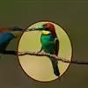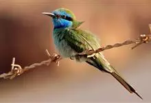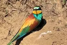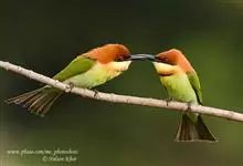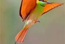 栗喉蜂虎是蜂虎科蜂虎属的鸟类。有热带鸟类羽毛艳丽的特征:喉部是栗红色的,黑色的过眼纹,翅膀和背部是绿色的,尾翼是蓝色的,飞行时翅膀下面的羽毛是橙黄色的,在阳光的照射下,它们全身闪烁着金属般的艳丽光泽,…全部>>