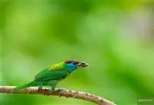 黑眉拟啄木鸟,为须䴕科、拟啄木鸟属的小型鸟类,体长20-25厘米,外形和金喉拟啄木鸟非常相似,但具粗著的黑色眉纹,头侧和耳覆羽以及下喉蓝色而不为银灰色,前颈两侧各有一块鲜红色斑。全部>>