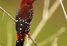 红梅花雀小型鸟类,体长9-10厘米。雄鸟通体朱红色,背、肩、胸等满布白色小斑点,两翅和尾黑褐色均具白色端斑,嘴红色,脚蜡黄色。雌鸟上体淡褐色或赭褐色,翅上中覆羽、大覆羽和内侧飞羽末端具白色斑点,…全部>>