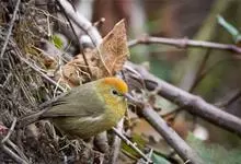 金头穗鹛小型鸟类,体长10~11厘米,是一种黄色小鸟。头顶金黄色有黑色纵纹,眼先黑色,在头、颊和耳羽金黄色的衬托下亦甚醒目。上体橄榄黄色,下体亮黄色,腹和两胁沾绿。…全部>>