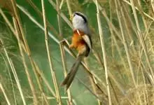 点胸鸦雀是莺科、鸦雀属小型鸟类,体长18-21厘米。头顶至枕橙棕色,嘴橙黄色、短而粗厚,脸皮黄色,耳覆羽和颊后部黑色,眼圈白色。上体棕褐色。颏黑色,其余下体淡皮黄白色,喉和上胸具黑色矢状斑。…全部>>