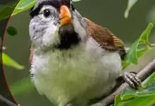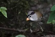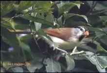 点胸鸦雀是莺科、鸦雀属小型鸟类,体长18-21厘米。头顶至枕橙棕色,嘴橙黄色、短而粗厚,脸皮黄色,耳覆羽和颊后部黑色,眼圈白色。上体棕褐色。颏黑色,其余下体淡皮黄白色,喉和上胸具黑色矢状斑。…全部>>