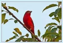 血雀雀科朱雀属鸟类,体重36-49克;体长155-182毫米。雄鸟除眼先、翼与尾为黑色外,通体为鲜红色;嘴鲜黄;雌鸟暗橄榄绿色,羽端较淡或带黄色;腰鲜黄;嘴较暗。虹膜褐色;嘴黄色;腿和脚褐色。…全部>>