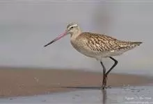 斑尾塍鹬,是鸻形目鹬科塍鹬属鸟类。其体形较大,体长约40厘米;喙较长,基部肉红色、尖端黑色而略向上翘;贯眼纹细而深,眉纹白色明显;雌鸟体型比雄鸟大,喙部也明显更长。非繁殖期雌雄鸟羽色相似,…全部>>