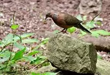 珠颈斑鸠,别名花斑鸠、珍珠鸠、花脖斑鸠、鸪鹪,是鸠鸽科副斑鸠属鸟类。体型中等,体长27~34cm,体重120~205g,雌鸟和雄鸟羽色相似,但雌鸟不如雄鸟羽色亮泽。珠颈斑鸠前额至头顶羽色稍淡,…全部>>