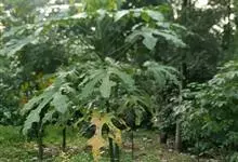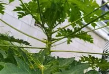 番木瓜,番木瓜科番木瓜属的常绿软木质小乔木,高达10米,具有乳汁;茎不分枝或有时于损伤处分枝;叶大且聚生于茎顶,近似盾形,叶柄中空;花单性或两性,有些品种雄株偶尔生两性花或雌花,…全部>>