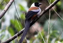 黑额树鹊是雀形目、鸦科的鸟类,体长约38厘米。黑色的尾甚长,上背、背、下腹及尾覆羽棕色。黑色的脸与灰色颈背及上胸成对比。与棕腹树鹊的区别在额、耳羽、喉及尾黑色,腰赤褐色。与灰树鹊的区别在腰赤褐色,…全部>>