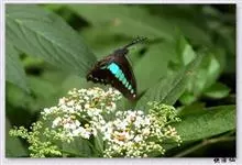 青带凤蝶Graphium sarpedon ,又名青凤蝶,是最普遍的中型凤蝶,飞行速度很快。青带凤蝶的翅膀中央有许多浅蓝色的斑点,很整齐地排列成一条直线。这些斑点由上而下逐渐变大,就像一条青色的带子。全部>>