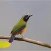 金额叶鹎是和平鸟科、叶鹎属的鸟类。体长16-20厘米。额和头顶前部金桔色,整个上体包括两翅表面草绿色。颏、喉黑色,其外围有一圈黄色,其余下体浅绿色,翼缘蓝紫色,翅上小覆羽翠蓝色。野外特征极明显,…全部>>