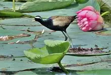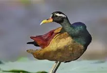 铜翅水雉雉鸻科铜翅水雉属的一种物种,是小型涉禽,体长28-31厘米。头颈、下体黑色,具金属色辉。从眼到颈有白色纵纹,背、内侧初级一飞羽橄榄铜绿色,尾下覆羽栗色。跗蹠的前后均有盾状鳞,趾、爪均甚长,…全部>>