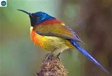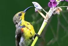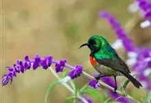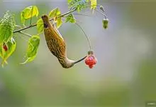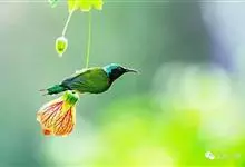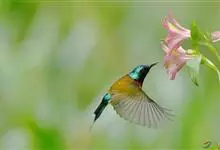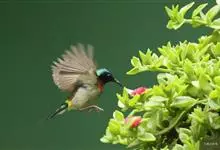 绿喉太阳鸟:共有9个亚种。小型鸟类,雄鸟体长13-15厘米、雌鸟10-12厘米。雄鸟前额至后颈、颏和喉辉绿色,头侧黑色,颈侧和背暗红色,两肩、下背橄榄绿色,腰鲜黄色,尾上覆羽和中央尾羽暗绿色,…全部>>
