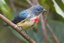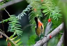 红胸啄花鸟:体重5-10克,体长60-92毫米。体形纤小。雄鸟上体呈辉亮的金属绿色;下体棕黄,胸部具一朱红色块斑,极易与其他啄花鸟区别。雌鸟上体呈橄榄绿,下体棕黄色。虹膜褐色,嘴褐黑色或角灰色,…全部>>