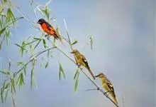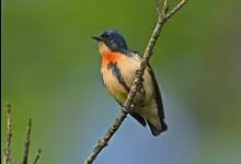 红胸啄花鸟:体重5-10克,体长60-92毫米。体形纤小。雄鸟上体呈辉亮的金属绿色;下体棕黄,胸部具一朱红色块斑,极易与其他啄花鸟区别。雌鸟上体呈橄榄绿,下体棕黄色。虹膜褐色,嘴褐黑色或角灰色,…全部>>