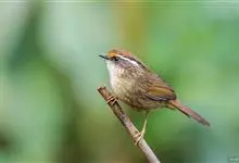 黄喉雀鹛是雀眉科、拟希鹛属小型鸟类,体长11-12厘米。头顶浅黄色具黑色鳞状斑,头顶两侧各有一道黑色侧冠纹,眉纹浅黄色、长而宽阔。上体灰绿色,两翅和尾褐色而具浅黄色窄缘。下体淡黄色。特征明显,…全部>>