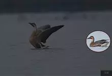 灰雁:体长70-90厘米,翼展147-182厘米,体重2.5-4千克,寿命17年。体大而肥胖。嘴、脚肉色,上体灰褐色,下体污白色,飞行时双翼拍打用力,振翅频率高。脖子较长。腿位于身体的中心支点,…全部>>