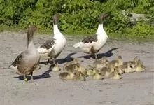 灰雁:体长70-90厘米,翼展147-182厘米,体重2.5-4千克,寿命17年。体大而肥胖。嘴、脚肉色,上体灰褐色,下体污白色,飞行时双翼拍打用力,振翅频率高。脖子较长。腿位于身体的中心支点,…全部>>
