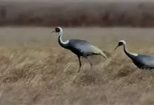 蓑羽鹤大型涉禽,体长68~92厘米,是鹤类中个体最小者。通体蓝灰色,眼先、头侧、喉和前颈黑色,眼后有一白色耳簇羽极为醒目。前颈黑色羽延长,悬垂于胸部。脚黑色,飞翔时翅尖黑色。…全部>>