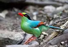 蓝绿鹊:中型鸟类,共有5个亚种。体长36-38厘米。尾长,嘴、脚红色。通体羽色主要为草绿色,宽阔的黑色贯眼纹向后延伸到后颈,在绿色的头侧极为醒目。两翅栗红色,内侧飞羽具黑色次端斑和白色尖端。尾绿色,…全部>>