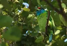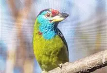 蓝喉拟啄木鸟,是须鴷科、拟啄木鸟属的鸟类。蓝喉拟啄木鸟为小型鸟类,体长20-23厘米。前额至头顶鲜红色,其上有一宽阔的黑色横带,将此红色分为前后二块;头侧、颏、喉蓝色,下喉两侧各具一红色点斑。…全部>>