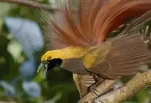 大极乐鸟是极乐鸟属中最大的鸟种。成年雄鸟体长可达到43厘米,雌性可达35厘米。雄鸟的额、颊、喉等墨绿色;头、颈黄色;上体暗赤栗色;腹部葡萄红色,胁部有长饰羽,其基部橙黄,中部黄色,…全部>>