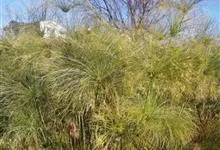 纸莎草是莎草科、莎草属的植物,具有粗壮的根状茎,高达2-3米,茎秆簇生,粗壮,直立,钝三棱形。叶退化呈鞘状,茎秆顶端着生总苞片,呈伞状簇生,总苞片叶状,披针形,顶生花序伞梗极多,细长下垂。瘦果灰褐色,…全部>>