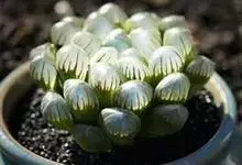 玉露,是阿福花科十二卷属多年生肉质草本植物。植株初为单生,逐渐呈群生状;肉质叶呈莲座状排列,叶片肥厚饱满,翠绿色,上半段呈透明或半透明状,有深色线状脉纹;叶顶端有细小的须;松散的总状花序,小花白色。…全部>>
