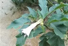 曼陀罗,茄科曼陀罗属一年生大型草本植物,全株光滑。有臭气;叶呈广卯形,边缘具不规则波状浅齿裂;花单生于枝杖间或叶腋,直立,有短梗;花萼是筒状裂片三角形,颜色为白色或淡紫色;果实为蒴果卵状,…全部>>
