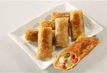 腐皮卷素菜是一道广东省的传统名菜,属于粤菜系。把香菇用清水浸软,去蒂,切细丝,胡萝卜,榨菜分别洗净,切细丝,豆芽,韭黄分别洗净,韭黄切段。用2汤匙油爆香姜丝,胡萝卜,榨菜,放入香菇同炒透,将豆芽放入…全部>>