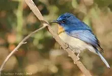山蓝仙鹟:小型鸟类,体长13-15厘米。雄鸟额基和眼先黑色,颏橙棕色,仅颏尖为蓝黑色,喉、胸、上腹和两胁亦为橙棕色,下体白色范围较小,仅局限于下腹和尾下覆羽。雌鸟上体少黄色,颏、喉、胸概为锈红色,…全部>>