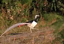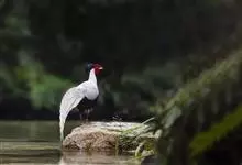 白鹇,是鸡形目雉科鹇属的一种留鸟。雄鸟上体白色并具黑色纹,下体黑色,头顶具黑色长羽冠,尾白而长;雌鸟体型较小,以橄榄褐色为主,下体具白色或皮黄色细纹;虹膜褐色,眼周具红色裸皮,喙黄色,脚鲜红色。…全部>>